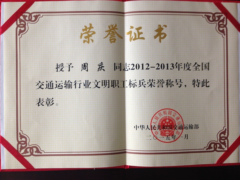 駕駛員周慶榮獲“全國(guó)交通運(yùn)輸系統(tǒng)勞動(dòng)模范”稱號(hào)