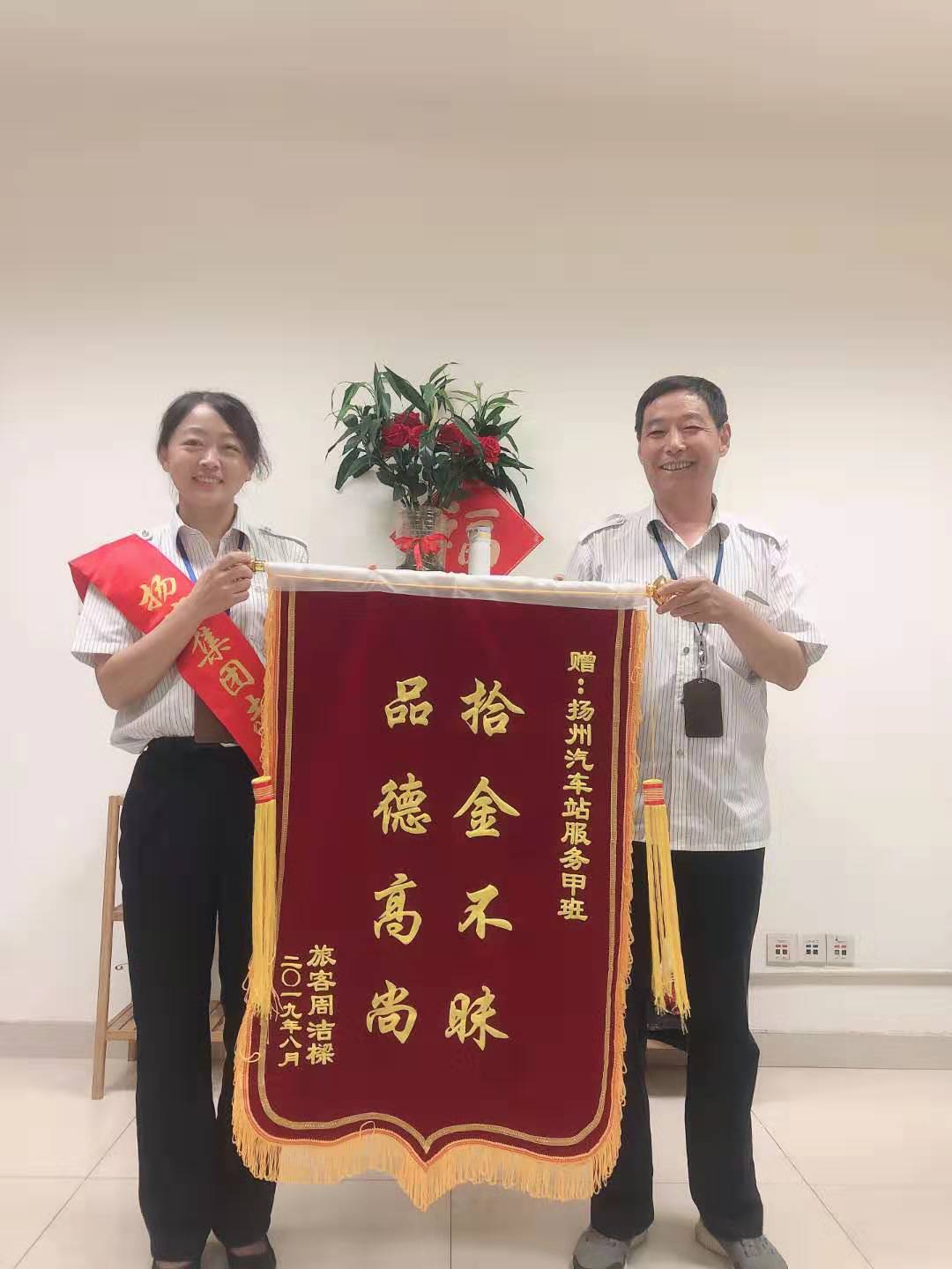 7月29日上午,揚州汽車客運東站收到旅客周信全送來的錦旗,稱贊駕駛員盧其棟“拾金不昧,道德高尚”。據(jù)了解,7月20日上午7點,旅客周信全不慎將包遺忘在了從揚州東站到南京的車上,包里有身份證、銀行卡、現(xiàn)金以及其他個人物品。當日值班駕駛員盧其棟在車輛抵達南京車站后,在檢查打掃過程中,發(fā)現(xiàn)了周信全遺失的挎包,并將此事及時上報調(diào)度室,并于第二日交還該旅客。