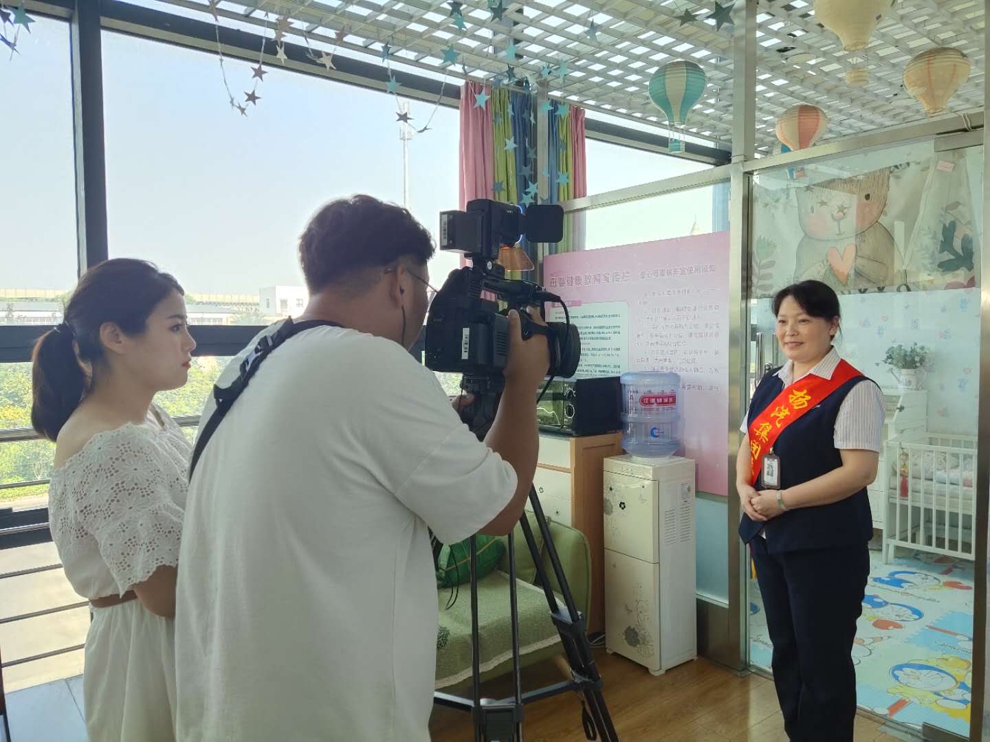 此次采訪主要以文明驛站——愛心母嬰室為主題,采訪過程中揚州站負責母嬰室服務的班長尹海霞對母嬰室的功能及服務進行了詳細的解說。