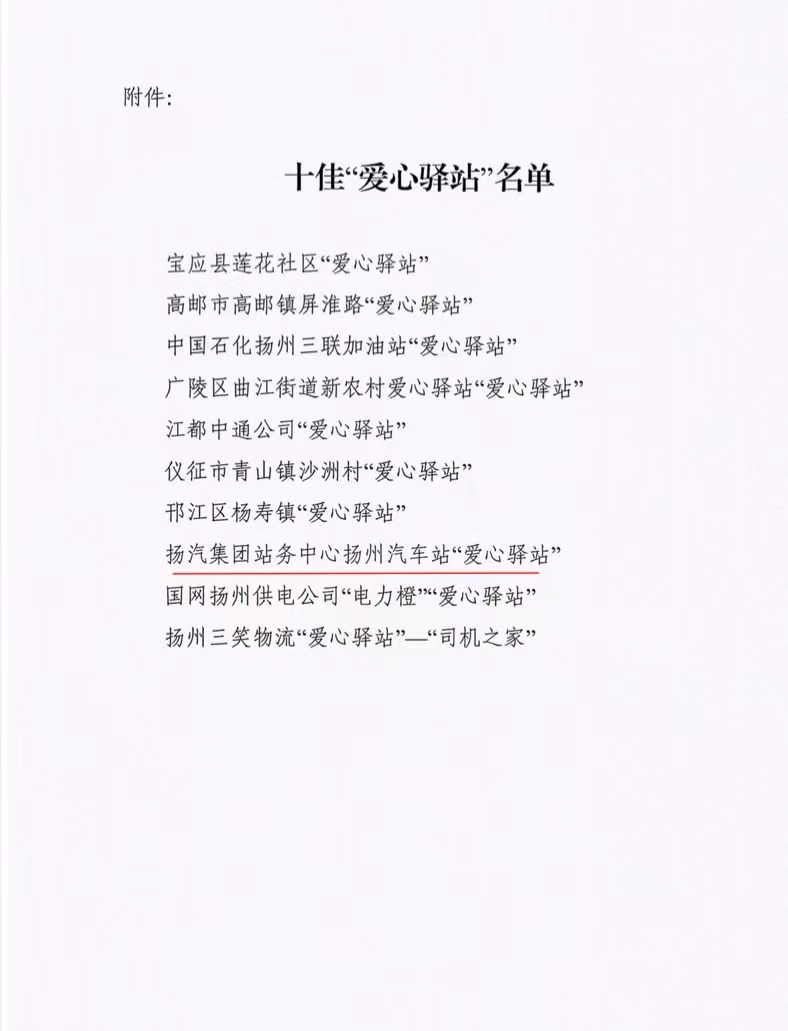 近日,揚(yáng)州市總工會(huì)印發(fā)《關(guān)于命名2022年度十佳“愛(ài)心驛站”的通報(bào)》,揚(yáng)汽集團(tuán)站務(wù)中心揚(yáng)州汽車(chē)站榮獲十佳“愛(ài)心驛站”榮譽(yù)稱(chēng)號(hào)。