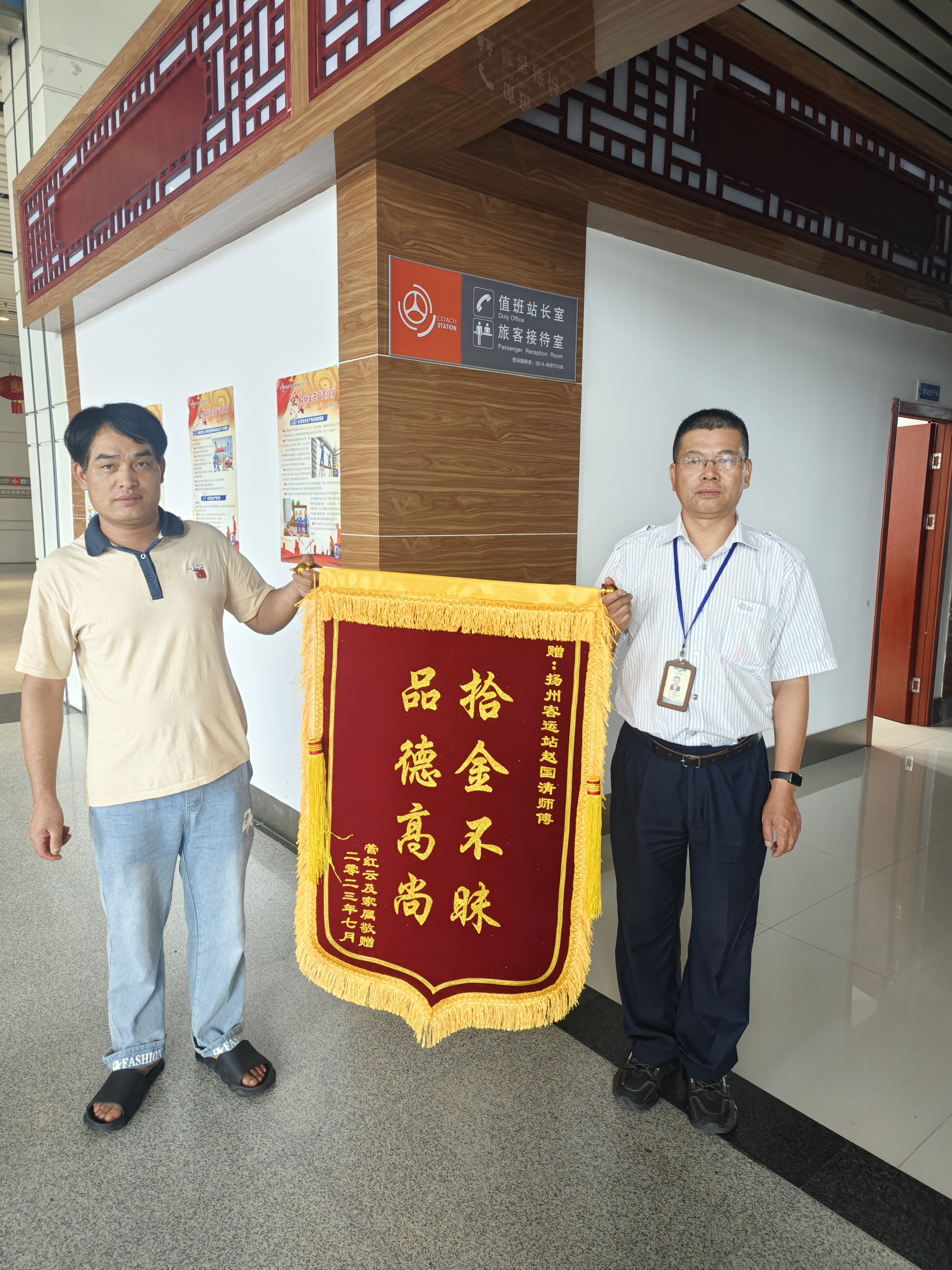 7月18日,失主管先生專門制作了一面“拾金不昧,品德高尚”的錦旗到揚州汽車站值班室對好人趙國清表示感謝。接下來,揚汽集團站務中心將繼續(xù)以黨建為引領,以榜樣為鏡,向榜樣看齊,充分發(fā)揮先鋒模范帶頭作用,深入推動“星級服務,溫馨之旅”黨建微品牌工作走深走實。