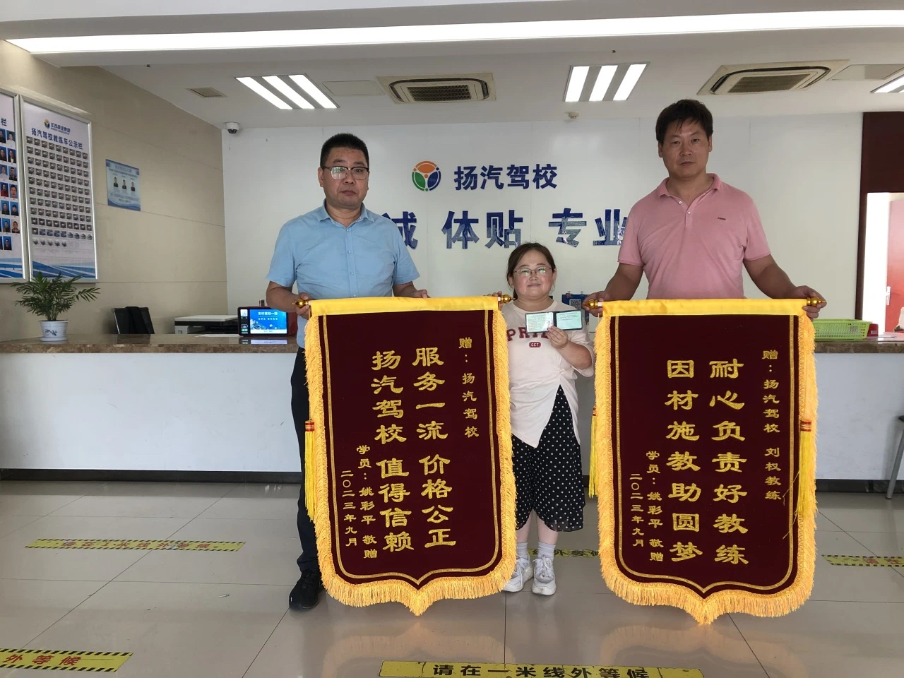 9月27日上午,在揚汽駕校西部樞紐招生大廳內(nèi),昨天剛取得C2駕照的學員姚彩平,將“服務一流、價格公正、揚汽駕校、值得信賴”、“耐心負責好教練、因材施教助圓夢”兩面錦旗送到了揚汽駕校主任顧軍和她的教練劉權的手上,感謝駕校工作人員和教練在她學車期間的認真教學、辛苦付出。