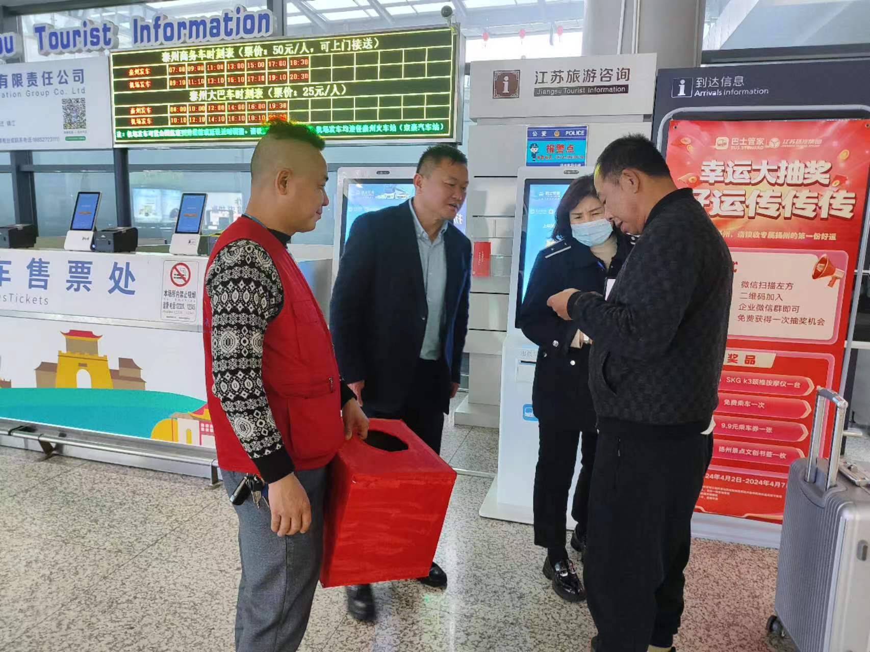 為更好地增強與旅客之間的互動和交流,拉進企業(yè)與旅客的距離,進一步向廣大旅客宣傳揚泰機場定制專線的運營模式,4月2日,集團揚泰機場定制專線在揚泰機場組織開展“幸運大抽獎,好運傳傳傳”機場旅客現(xiàn)場抽獎活動。